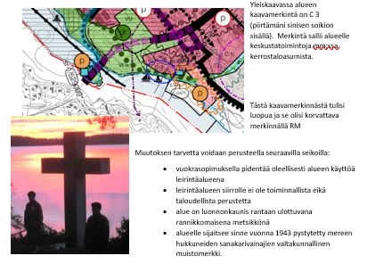 Merkintä tulisi olla RM sellaisella lisäviitteellä, että alue on tarkoitettu leirintäalue käyttöön ja alueelle sallitaan ympäristöön sopivaa pienimuotoista rakentamista. Lisäksi tulisi edellyttää, että rakentamisella ei saa vaarantaa alueen luonnon ympäristön maisema-arvoja. Erityisesti olisi huolehdittava, että valtakunnallisestikin merkittävän muistomerkki ympäristöineen säilyy arvokkaana kulttuuriperintökohteena.Naantalissa 1 pnä helmikuuta 2021