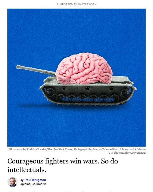 Uudessa kolumnissaan hän arvioi, että yksistään rohkeat soturit siis kovat kundit eivät ratkaise, vaan kuten jo toisessa maailmansodat kuin nyt Ukrainassakin sittenkin moraalisen rohkeuden ohella tarvitaan kapasiteettia ja luovaa kykyä ja intellektuelleja.