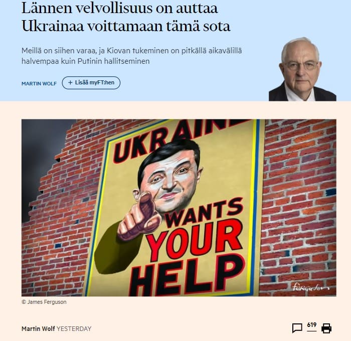 Kyllä, on tuskallista kärsiä tämän sodan aiheuttamasta energiasokista. Mutta lännen velvollisuus on selviytyä. Ukraina ja ukrainalaiset kantavat konfliktin suurimman osan. Meidän mukavassa lännessä on annettava heille heidän tarvitsemansa resurssit. Vasta kun Putin tietää, ettei hänen anneta voittaa, sota todennäköisesti lopulta päättyy. martin.wolf@ft.com