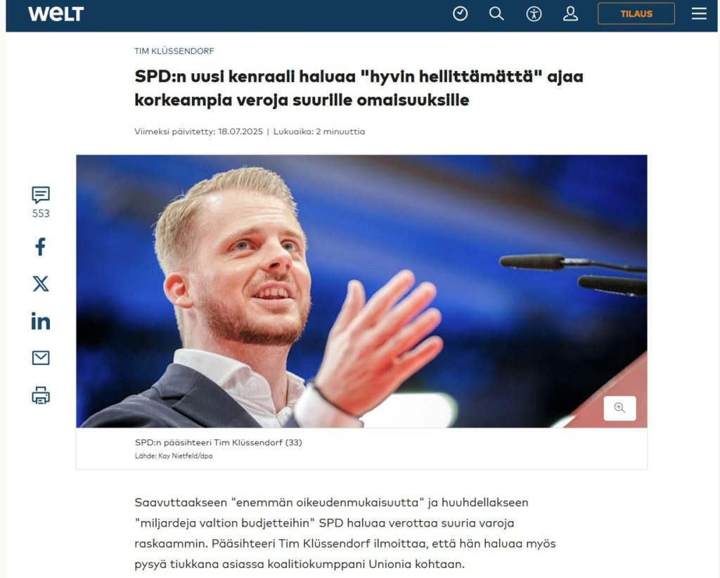 SPD:n johtaja Lars Klingbeil oli esittänyt samanlaisia kommentteja puoluekokouksessa kesäkuun lopussa. Koalitiosopimuksessa olisi toivottu, että huipputuloja ja erittäin korkeaa omaisuutta ja perintöä käytettäisiin paljon voimakkaammin yhteisen hyvän rahoittamiseen, hän sanoi. SPD:llä ei kuitenkaan ole tällä hetkellä enemmistöä tässä asiassa. ”Ja meidän on muutettava sitä.” Welt eilen