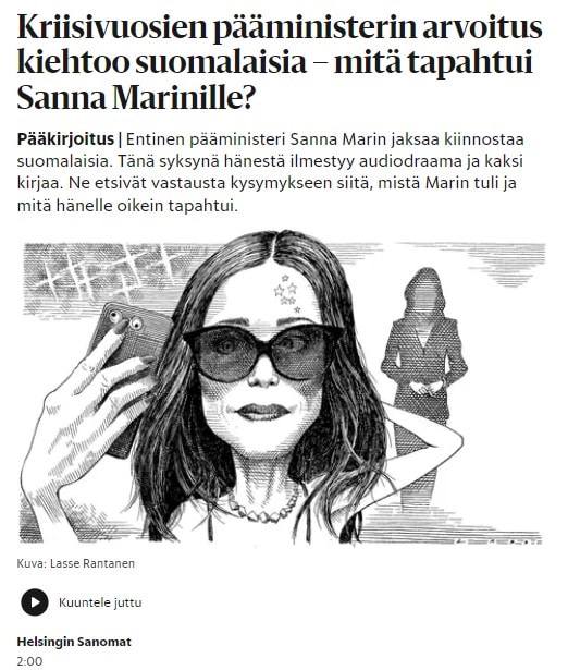 Sanna Marin pääministerikausi oli kova – vastaava ei rauhanajan Suomesta löydy. Sanna on kiinnostava ilmiönä, mutta kyllä kaupalliselle lehdistölle juuri se – mistä häntä moititaan – hänen kuvansa on tärkeä myyntikeino.