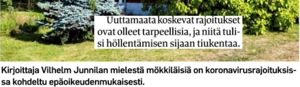 Naantalin Mr. Hyde Vilhelm Junnila puolustaa Rannikkoseudussa suomalaisten oikeutta mökkeilyn luomalla kuva, että mökkeilyharrastusta oltaisiin rajoittamassa. Vilhelm voisi tarkoittaa tarkoittiko hän malttia vaativaa presidenttiä, ja pidättäytymistä suosittelevaa pääministeriä vai uusia rajoituksia Uudenmaan vapauttamisen tilalle vaativaa Kokoomuksen Mykkästä tai Uudenmaan rajoitusten jatkoa kannattavaa Tavioita?