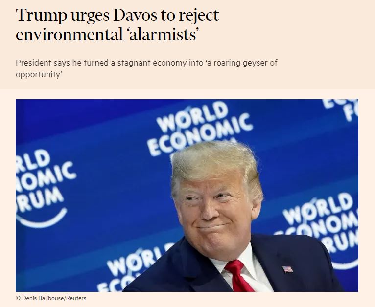 Hän on antanut päättäväisen äänen tapahtumassa, jota hallitsevat ilmastomuutoksen uhat ja talouden taantuma. Yhdysvaltain presidentti omistaa suuren osan puheestaan väitteelle, jonka mukaan hän oli muuttanut Yhdysvaltojen lamaantuneen talouden ” ”mahdollisuuksien geysiriksi”. Viesti oli tarkoitettu USA:n äänestäjille. Hän julisti, että on ”hylättävä monivuotiset tuomion päivän profeetat ja maailman lopulla pelottelijat. Ja Trump sanoi: ”Tämä ei ole pessimismin aika, tämä on optimismin aika.” ja jatkoi, että Yhdysvallat oli ”keskellä taloudellista nousua, jonka kaltaista maailmaa ei ole koskaan ennen nähty. ” Yhdysvallat oli edelläkävijänä ”uuden kauppamallin 2000-luvulle”, hän väitti. Hänen kauppaneuvotteluidensa toinen vaihe Kiinan kanssa alkaisi ”hyvin pian”, hän sanoi, ”suhteemme Kiinaan eivät ole todennäköisesti koskaan olleet paremmat”. Yhdysvaltain presidentti tervehti suhteitaan Kiinan Xi Jinpingiin ”epätavallisena” sanomalla: ”Hän on Kiinan puolesta, minä olen Yhdysvaltojen puolesta, mutta me rakastamme toisiamme.” Hänellä oli myös lämpimiä sanoja Boris Johnsonille sanomalla, että Yhdistyneen kuningaskunnan ”upea uusi pääministeri haluaa todella tehdä sopimuksen, kuten lupasi”. Näin FT referaatin referaatti kuului.