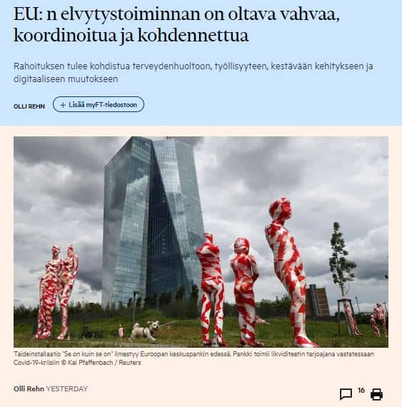 Olli Rehn oli talouskomisaarina  finanssikriisin myrskyn silmässä ja tietää mistä puhuu. Ei siis ole ihme, että häntä arvostetaan. Hyvä esimerkki oli FT:n artikkeli, missä Rehn hahmotteli nopeiden ja pidemmän tähtäimen välttämättömiä toimia.