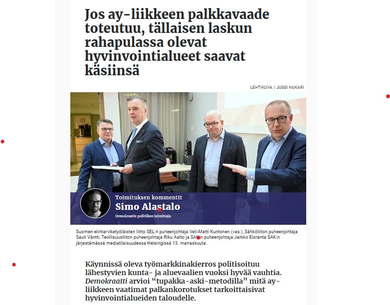 Ja on siellä kannettu huolta hyvinvointialueiden tilanteesta https://demokraatti.fi/jos-ay-liikkeen-palkkavaade-toteutuu-tallaisen-laskun-rahapulassa-olevat-hyvinvointialueet-saavat-kasiinsa