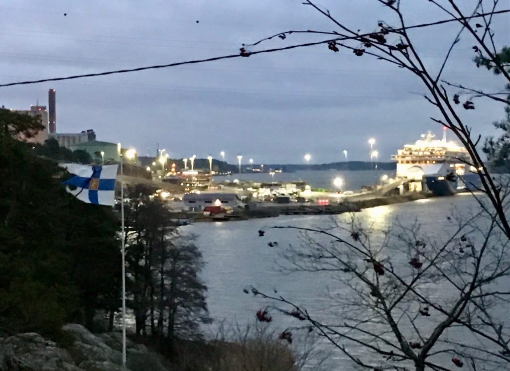 Kuva tämän kertoo lähihistoriasta ja nykyajasta: Puolustusvoimien lippu ja länteen – Ruotsiin liikennöivä -italialaisen varustamon laiva.