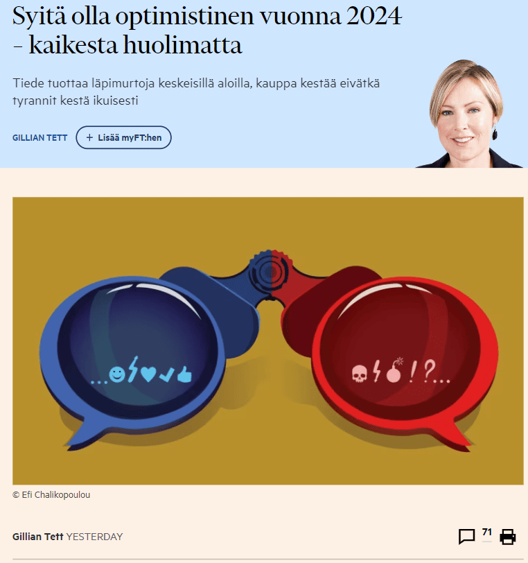 Siksi on arvokasta, että hän lehdessään vaivautunut tekemään kymmenkohtaisen optimismiin oikeuttavan luettelon: