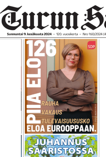 Turun Sanomien etusivun juttu on Piia Elon mainos: Tulevaisuususkon, rauhan ja vakauden asia vaatii ääniä.