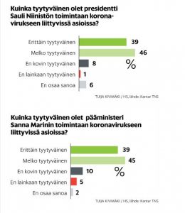 Erittäin tai melko tyytyväisiä Niinistöön oli 85 % ja Mariniin 84%.