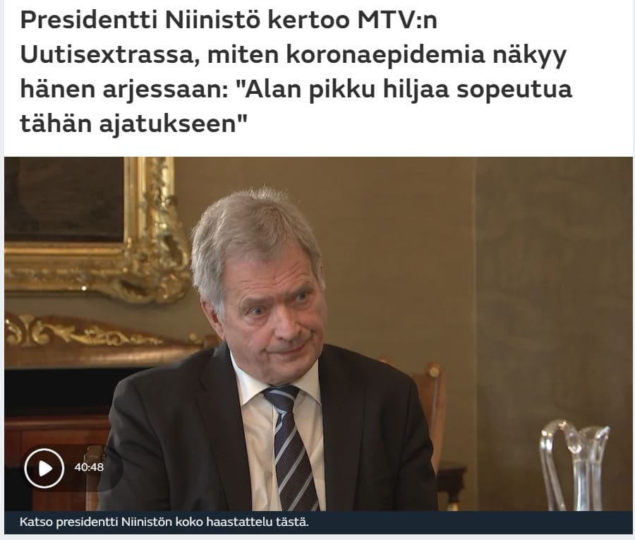 Episodi unohtamista ei tämä MTV:n haastattelu varmaankaan edistänyt, vaan se saa edelleen valtioviisaat kannunvalajat aprikoimaan ja arvioimaan, mistä tässä on kysymys. Ja jatkoa siis seuraa :Presidentti kun lupaa kantta huolta korona kriisistä ja ilmiöstä, joita se tuottaa ehdolla , että huoli on syvä ja aiheellinen. Työttömyyttä, syrjäytymistä, konkursseja ja valtion talouden epätasapainoa on odotettavissa.