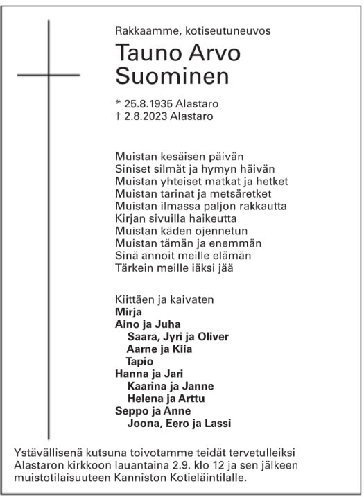 Muistoa kunnioittaen, on fraasi, jonka kuulemme hautajaisissa ja luemme muistokirjoituksissa. Ei se tyhjää puhetta ole -niin ei saa ymmärtää- eikä toinen ole parempi toista viimeisellä matkalla. Mutta inhimillistä on , että joskus ilmaisu tuntuu erittäin sopivalta. Näin Tauno Suomisen tapauksessa.