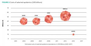 Ja toinen kuva, jossa on taas arvioitu voitettujen epidemioiden laskettuja kustannuksia; Ne ovat olleet ”vain” kymmeniä miljardeja , kun raportissakin arvioidaan, että uuden pandemian kustannukset voisiat nousta kolmeen (3) biljoonaan. eli jopa kymmeniä kertoja koettuja suuremmaksi. (Huom. englanniksi miljardi on biljoona ja meidän biljoona t biljoonaa.)