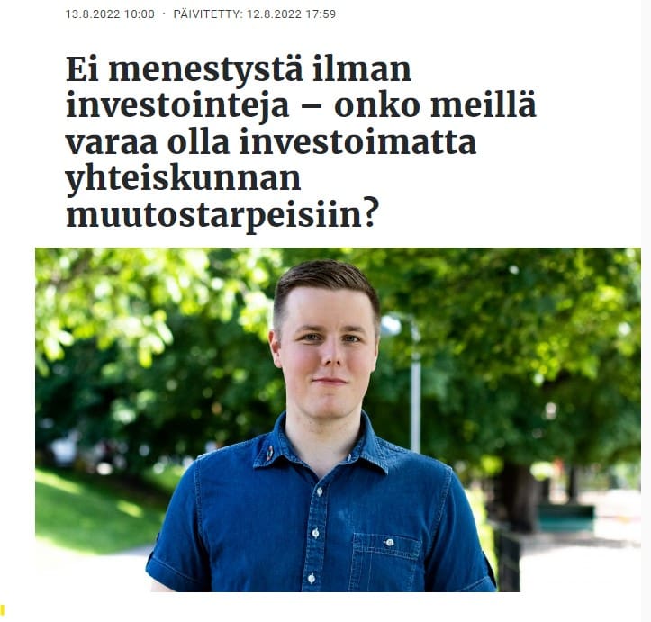 Investoinnit tulevaisuuteen, kuten ilmastonmuutoksen torjuntaan, koulutukseen, terveyteen ja digitalisaatioon eivät olekaan pelkästään välttämättömiä yhteiskunnallisia muutostarpeita, vaan myös edellytyksiä tulevalle kasvulle, taloudelliselle kilpailukyvylle sekä menestymiselle kansainvälisillä areenoilla. Viisaat investoinnit tulevaisuuteen tuovat kansantalouteen niin kasvavia tuloja kuin säästettyjä euroja, joilla pystytään vastaamaan tuleviin haasteisiin. Siksi leikkaaminen menoista ei olekaan ainoa vaihtoehto talouden pitkän aikavälin sopeuttamiselle: huonosti kohdistetuille menosopeutuksilla päinvastoin viedään taloudesta usein myös aineksia tulevasta kasvusta sekä tietenkin hyvinvoinnista. Investointien valtiontaloudellista hyötyä ei voi katsoa vain plussana tai miinuksena tilikirjassa, vaan investointien hyötynä pitkällä aikavälillä.