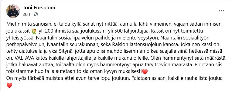 Olen hämmentynyt siitä määrästä, jotka haluavat auttaa, toisaalta olen myös hämmentynyt apua tarvitsevien määrästä. Pidetään siis toisistamme huolta ja autetaan toisia oman kyvyn mukaisesti On myös tärkeää muistaa ettei avun tarve lopu jouluun. Palataan asiaan,