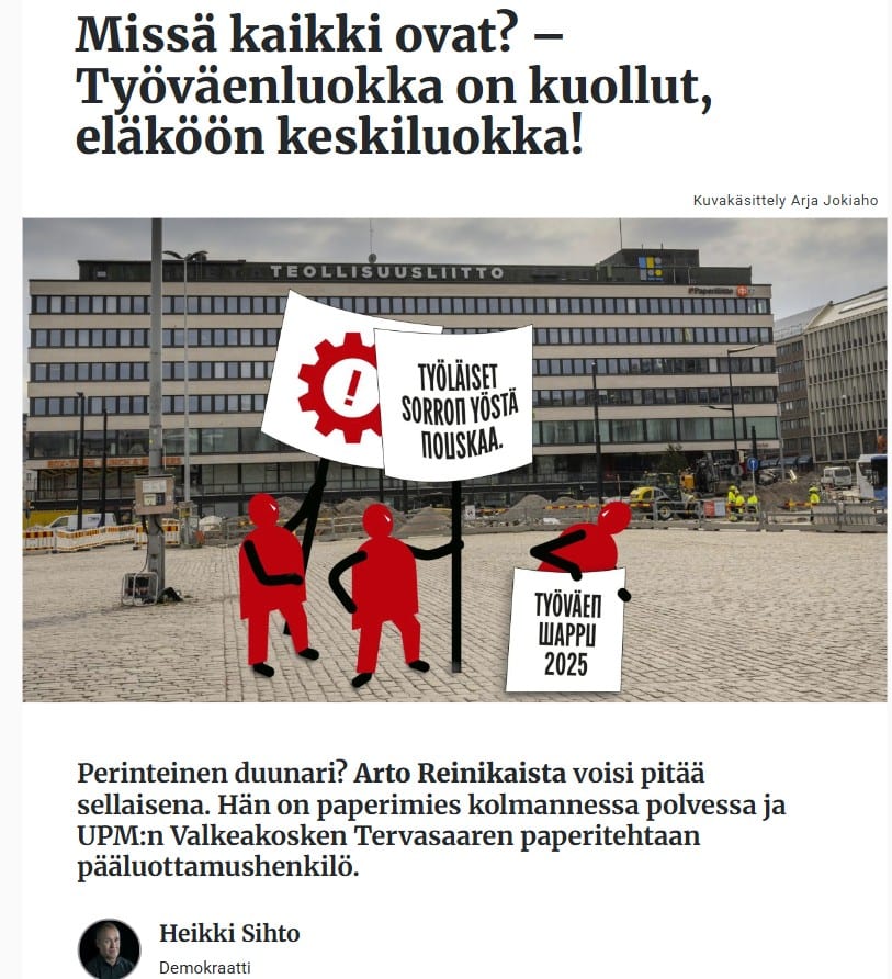 Olemme usein hämmästelleet, että miten niin monet tavalliset palkansaajat tuntevat veto oikeistolaisuuteen vastoin omaa etuaan. Vastaus nykyisellä pitkällä kokemuksella on, että kyse on sekä veto-, että työntövoimasta. Tarkoitan, että fiininpään joukkoon kuuluminen tuntuu hyvältä kun taas työväenliikkeen perinteessä on paljon aikaansa elänyttä.