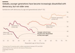 Tyytyväisyys demokratiaan on vähenemässä maailmanlaajuisesti, etenkin nuorten keskuudessa. Tiedot korruptiosta ja elinajanodotteesta Yhdysvalloissa osoittavat myös selkeitä merkkejä suhteellisesta epäonnistumisesta.