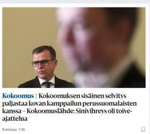 Pieni uhka näyttää olevan siinä, että suhtautumine EU-jäsenyyteen voisi joutua kyseenalaiseksi, jos Kokoomuksen pyrkimykset (HS 14.1.2021) estää puoleen kannatuksen valuminen Perussuomalaisiin pyrittäisiin estämään puoleen linja oikeistolaistamisella ja syvenevällä porvarillisella yhteistyöllä.