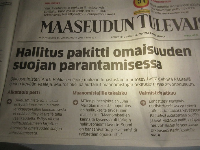 Ja pääotsikko oli pääasia: Maanomistajaa sorretaan.