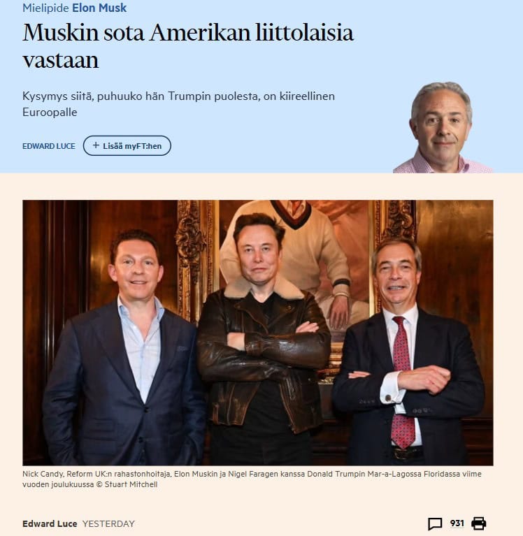Muskin hiljaisuus Kiinasta on helpompi ymmärtää. Hänen Tesla-yrityksellään on siellä suuria toimintoja, joita hän ei halua ottaa riskiä. Trumpin oletuslähestymistapa maailmaan on transaktiaalinen; hänen Kiina-politiikkansa on edelleen kiinni. Sitä vastoin Musk vahvistaa Trumpin ihailua Vladimir Putinin Venäjää kohtaan ja halveksuntaa Eurooppaa kohtaan. Olisi äkillistä olettaa, että Musk vain trollaa. Tämä ei myöskään ole vain rahasta kiinni. Trumpin ja Muskin antipatia eurooppalaista liberaalia demokratiaa kohtaan on todellinen. Hän jakaa Trumpin kärsimättömyyden lopettaa Ukrainan sota ehdoin, jotka saattavat päätyä Venäjälle suotuisiksi. AfD lupasi lopettaa Saksan tukemisen Ukrainalle. Starmer on lisännyt Britannian apua.