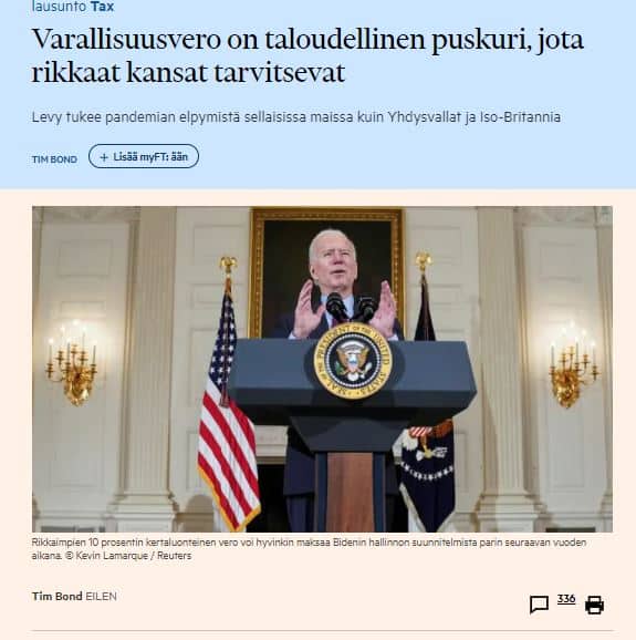 Suomessa ei mikään värähdä. Täällä vaan pyydettään leikkauslistoja tai sitten verotuksessa pyöritään vain välillisten verojen tai tuloverotuksessa korkeintaa raippaverojen kimpussa. Omaisuus saa olla rauhassa siitä huolimatta, että Suomessakin on tuulen tuomia voittoja satanut laariin roppa kaupall rikkaimmille. Mikä meitä vaivaa?