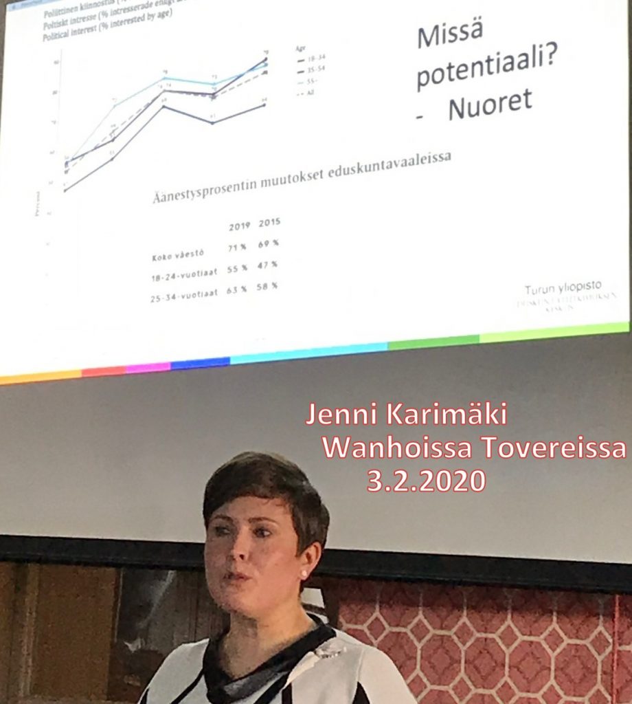 Turun Wanhojen Tovereiden kuukausi palaverien esitelmöitsijänä oli 3.2..2020 Eduskuntatutkimuksen erikoistutkija VTT Jenni Karimäki.