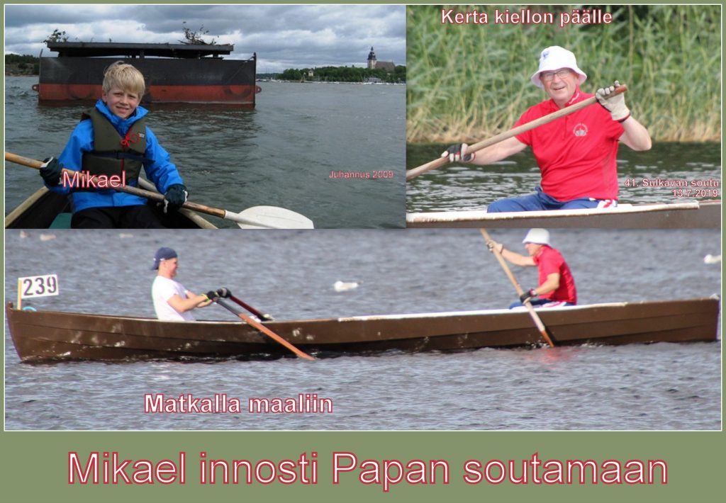 Mikael on pienestä pitäen ollut valmis souturetkille ja hänen kanssa jatkoimme Anttonin kanssa aloitettuja perinteisiä juhannussoutuja. Niiden leppoisuus oli nytkin mukana ponnistelujen kovenemisesta huolimatta. Kilpailuhenkinen Mikael sieti ihailtavalla tavalla tallaista tasaisen vauhdin kiiruhtajaa ja niin matka taittui, että vuoroista johtuen hän souti vain 12 minuuttia enemmän; sen minkä jäin jälkeen sen hän otti kiinni. Niin se matka sujui ja mieleen jäi kiitollinen tunne ja pysyvä mukava muisto.