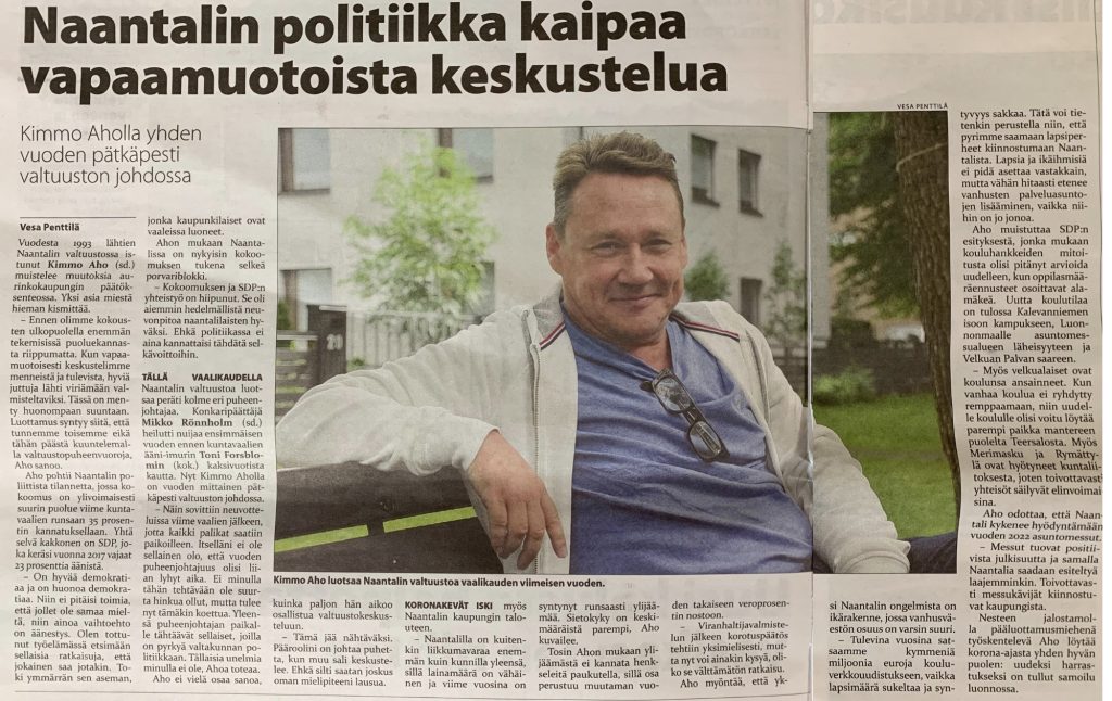 Aho pohtii Naantalin poliittista tilannetta, jossa kokoomus on ylivoimaisesti suurin puolue viime kuntavaalien runsaas 35 prosentin kannatuksellaan. Yhtä selvä kakkonen on SDP, joka keräsi vuonna 2017 vajaat 23 prosenttia äänistä.