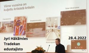 Tradekan edustajiston talouspoliittisen puheenvuoron käyttää kuvassa Jyri Häkämies. Tapahtuma paikka on Paasitorni eli Helsingin Työväentalo ja kokous on Tradekan edustajisto. Ennakkoluulottomuutta. Yksi juttu kuitenkin EK:n johtajan kriisikalvoilta puuttui: Työnantajien jääräpäisyys….