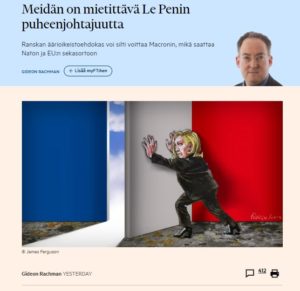 Gideon Rachman aloittaa kolumninsa : “Politiikka, jota edustan, on politiikkaa, jota herra Trump edustaa. Samaa edustaa herra Putin. Näin Marine Le Pen puhui vuonna 2017. Vain kahden viikon kuluttua hänet…