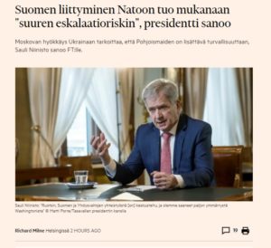 Niinistö on oikaissut otsikkoa: Suomi varoittaa “suuresta eskalaatioriskistä” Euroopassa Nato-jäsenyyskeskustelussa Moskovan hyökkäys Ukrainaan tarkoittaa, että Pohjoismaiden on lisättävä turvallisuuttaan, presidentti sanoo FT:lle TP Sauli Niinistö puhuu FT:n kautta ja antaa…