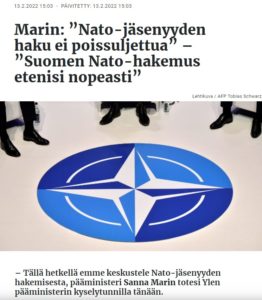 Demokraatti uutisoi pääministerin haastattelua: Demokraatti.fi – Tällä hetkellä emme keskustele Nato-jäsenyyden hakemisesta, pääministeri Sanna Marin totesi Ylen pääministerin kyselytunnilla tänään. Marinin mukaan ei kuitenkaan ole poissuljettua, että Suomi hakisi tällä vaalikaudella Nato-jäsenyyttä….