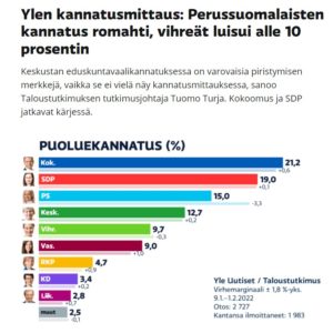 Perussuomalisten kannatus on laskussa on pääviesti. Puolue menettää Kokoomukselle ja pienpuolueille. Näin analysoidaan ja iskua pidetään vakavana. Aluevaalien vaikutus näkyy tietenkin, koska mittaus on tehty vaalikampanjan aikana ja tulosten selvittyä….