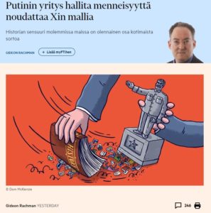 Blogissani lainasin Gideon Rachmanin artikkelia Putinin historian selityksistä. Itsevaltiaiden johtajien kirjoituksia kannattaa lukee tarkasti rivien välistäkin. Niin hekin tekevät ja viittaan tässä siihen, että Mein Kampfin lukeneet tiesivät, että…