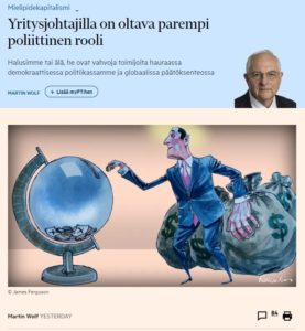 Suosikki FT:n kommentaattorini Martin Wolf kirjoittaa yritysjohtajien vastuusta ja merkityksestä. Kolumni kannatta lukea tästä Me länsimaissa kohtaamme kaksi kriisiä: demokraattiseen poliittiseen järjestelmäämme kohdistuvan luottamuksen romahtamisen ja planeetan ympäristöuhan. Edellinen edellyttää…