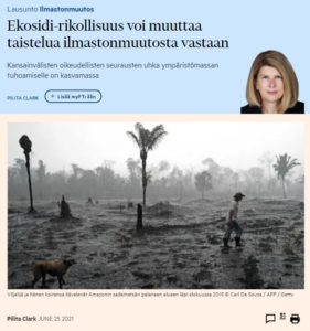 Pilita Clarkin kolumni, jossa hän kertoi, että ekosidin (ecocide) eli ympäristötuhon määrittäminen rikokseksi on aavistuksen verran lähempänä toteutumistaan. Kolumnissaan hän kuvaa mistä voi olla kysymys ja sen lisäksi hän kertoo,…