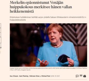 Angela Merkel oli pettynyt EU:n huippukokouksen päätökseen, jolla Saksan -Ranskan ehdotus Putin-huippukokouksesta tyrmätiin. Kokousta pidetään Merkelin epäonnistumisena ja merkkinä vaikutusvallan hiipumisesta, “rampa anakka” ilmaisuakin käytettiin kommenteissa: https://www.ft.com/content/2521879b-7075-4abb-9e9f-29a58265a019 Saksa näyttää myös…
