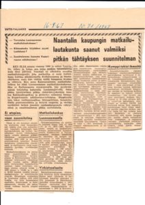 Kaupungin matkailulautakunta oli aktiivinen ja lennokas. Ohessa on isäni jäämistön seasta käteen sattunut lehtileike. Luolanjärven kalastuskohde on jäänyt haaveeksi sen sijaan Kalevanniemi, Kailo ja Luonnonmaa ovat täyttä totta. Ehkäpä näkötorni…