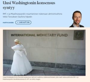 Kuvakaappaus kerto, että ei ole paljonkaan aikaa kun IMF:n talouskuria vastaan protestoitiin. Nyt kaikki on muuttunut niin paljon , että artikkelin kirjoittaja Martin Sandbu kuvaa, että IMF:n täyskäännös pistää Saul…
