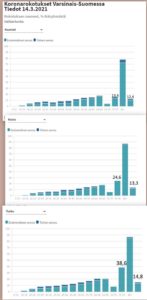 Tilastot kertovat, että Varsinais-Suomessa tilanne synkkenee. Nousuvauhti on kova – eikä sattuma selitä kaikkea. Rokotusvertailu, kuten kuvasta näkyy, kertoo, että Naantali tule muiden perässä erityisesti kahdessa ylimmässä ikäryhmässä ollaa perän…
