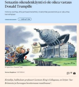 Lontoon King’s Collegen professori Vernon Bogdanor, joka on kirjoittanut kirjan ”Iso-Britannia ja Eurooppa levottomassa maailmassa”, epäilee FT:n kirjoituksessa (https://www.ft.com/content/bef51bde-204d-4bc2-8c75-c1e174346853) , että Trumpin syyttämien on väärä keino. Hänen lähtökohta on: Donald…