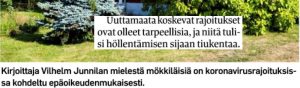 Naantalin demareiden www.sdpnaantali.fi sivujen ajankohtaispalstalla oli 17.4.2020 artikkeli koskien viimeisintä puoluekannatusgallupia otsikolla: Happamia ovat Marinin pihlajamarjat. Jutun lopun kappale kuului: Naantalin Mr. Hyde Vilhelm Junnila puolustaa Rannikkoseudussa suomalaisten oikeutta mökkeilyn…