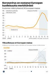 Tällä palstalla on seurattu tilastoja. FT:ssä on ilmestynyt maakohtaisia arvioita myös vertailua normaaliaikaan. Merkillepantavia eroja havaitaan suhteellisissa luvuissa. Euroopassa pahin on tilanne Italiassa 90 prosenttia normaalia enemmän, kun taas Norjassa…