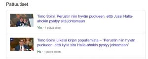 “PERUSSUOMALAISTEN entinen puheen¬johtaja, Juha Sipilän hallituksen ulkoministeri Timo Soini (sin) astui maanantaina julkisuuteen seitsemän kuukauden hiljaiselon jälkeen. Niinpä tiedotusvälineiden jakamaton huomio oli taattu. Soinin syy tulla julkisuuteen oli tuore julkaisu….