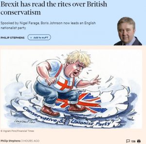 Brittien sekamelska olisi naurettavaa ellei siihen liittyisi vaarallisia seurauksia. Yhdestä näkökulmasta ei Euroopan Unionin vaan Brittien saarten unionin kohtalosta kirjoittaa Philip Stephens, joka aloittaa kolumninsa ingressillä, jossa hän kertoo, että…