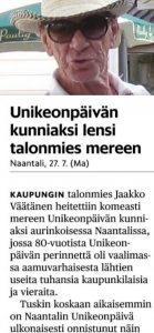 Naantalissa juhlittiin 60. Unikeonpäiviä eilen . Tänään HS:n palstalla 50 vuotta sitten oli tänään pieni artikkeli, jossa kerrottiin ennätysyleisöstä, kun Väätäsen Jaskan perässä kulkueena marssittiin Kalevanniemeen siksi, että rannan paikat…