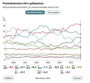 Näin Hesari tulkitsee: Muutokset marraskuun kannatusgallupissa ovat pieniä. Perussuomalaisten kannatus on kohentunut lokakuusta 0,6 prosenttiyksikköä. Oppositiopuolue keskustan suosio on puolestaan heikentynyt 0,4 prosenttiyksikköä. Muut muutokset ovat pienempiä. Kaikki muutokset mahtuvat tutkimuksen…