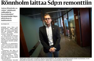 Jotenkin outoa: Sdp:n uusi puoluesihteeri Antton Rönnholm, 36, joutuu vastailemaan vielä koko ajan kysymyksiin demariutensa aitoudesta. Ainakin puolueen ulkopuolisille. Ei siksi, etteikö hän osaisi puhua aatetaustastaan ja arvopohjastaan uskottavasti. Mutta…