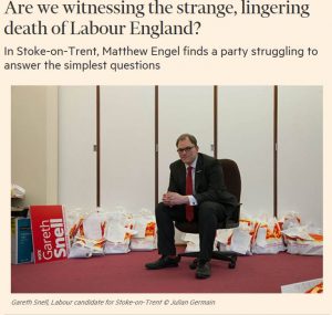 10 helmikuu 2017 FT:ssä: Matthew Engel: Olemmeko todistamassa outoa, pitkittyvää Työväenpuolueen kuolemaa. Matthew Engel toteaa puolueen kamppailevan Stoke-on-Trent:ssä tämän yksinkertaisin kysymyksen kanssa. Ennen kuin lähdin kotiin, Chris Lee, Labour-puolue…