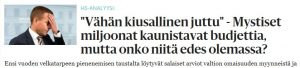 Tuomas Niskakangas kirjoitti Hesarissa 10.9.2016 valtion velkaantumisen yllätyskäänteestä: Myyntitulojen arvioiden läpinäkymättömyys tarjoaisi mahdollisuuden tehdä arvioita, jotka näyttävät poliittisesti hyvältä. Budjettiin kirjaukset tehtiin Orpon alaisuudessa olevan valtiovarainministeriön budjettiosaston toimesta. Pohjana käytettiin…