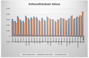 TS:n kuvio lisäyksistä ja vähennyksistä.Taulukko, jossa ei leikkauksta 400 €/as V-S:n Sote-menot euroa asukasta kohden Kunta Tuleva Nykyinen Lisäys Raisio 3 087 2 758 329 Rusko 2 743 2 442…